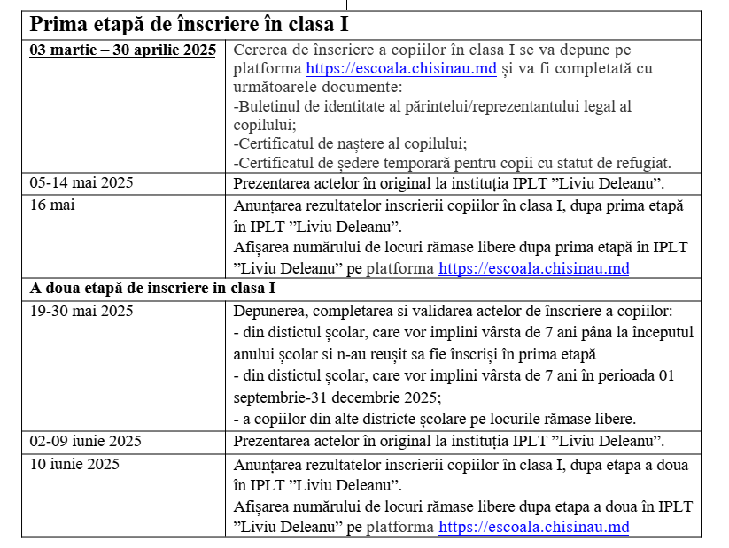 - Fișa medicală perfectată pâna la data înscrierii, până la 01.09.2025;